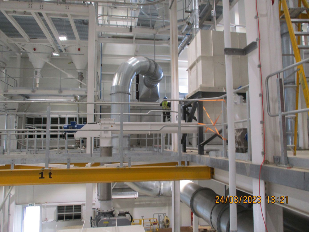 Montage der Walzenlinien mit Transportbändern und Conchen; Montage der Trockenkomponenten Silos, Verwiegung und Kleinkomponenten
